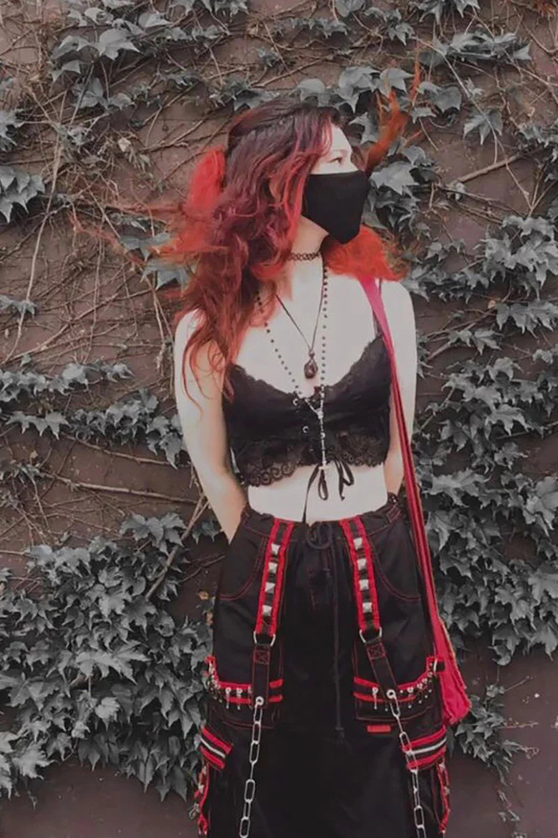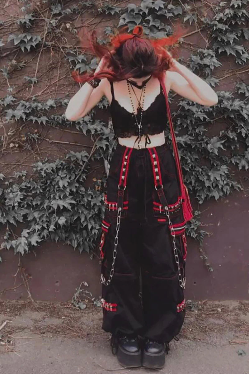 Get pierced by punk in these sick street goth pants! Black and baggy, these Tripp pants feature red stitch detailing, cargo pockets, and adjustable ankles for a change in fit. Loaded with safety pin hardware, zipper details, metal D-rings, and chains for days. Zip off the pants legs to transform these Tripp pants into shorts!